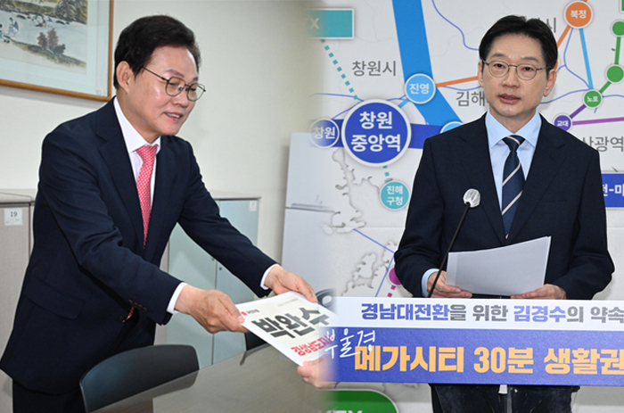 ์ฒซ ๋ฒ์งธ๋ ๋ถ์ฐยท์ธ์ฐยท๊ฒฝ๋จ ํ์ ํตํฉ ๋ฌธ์ ์ ๋๋ค. ๊น๊ฒฝ์ ํ๋ณด๋ "๋ถ์ธ๊ฒฝ ๋ฉ๊ฐ์ํฐ ๋ณต์"์ 1ํธ ๊ณต์ฝ์ผ๋ก ๋ด๊ฑธ์๊ณ , ๋ฐ์์ ํ๋ณด๋ "2028๋ ๊ตญํ์์ ์ ๊ฑฐ ๋ ํตํฉ๋จ์ฒด์ฅ ์ ์ถ"๋ก ์ผ์ ์ ๋ฏธ๋ค์ด์.
